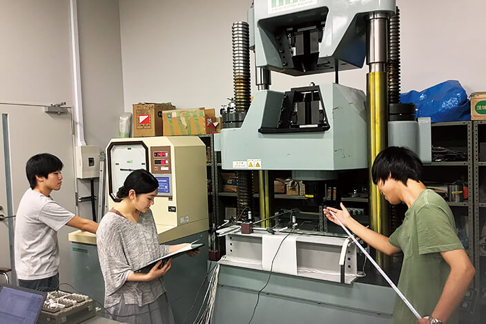 建築物の主要な構造材料の物理的性質、鉄筋コンクリートや鉄骨の構造部材の基本的な力学的性質を実験などの実習を通して体感し、これらの材料や構造部材に対する知識を具体的に体得します。​