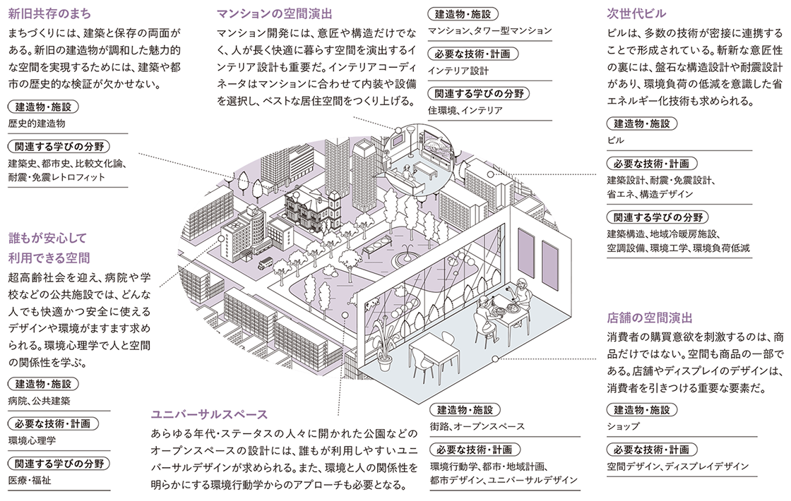 未来の豊かな建築・都市空間を創出していくためには、豊富な専門知識と主体である人間や社会にまつわる様々な理解、さらに先見性や創造力を養う必要があり ます。建築学科ではこれらに対応した人材を養成するための多彩なカリキュラムを行っています。なお、大学院では在学中に二級建築士の取得、さらに2年間で 一級建築士の実務経験を満たすことができるプログラムを用意しています。そのため首都圏初の本学建築学科付属の一級建築士事務所を設置しています。