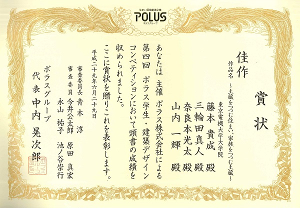 建築・都市空間研究室のメンバーが「POLUS-ポラス-学生・建築デザインコンペティション」で受賞