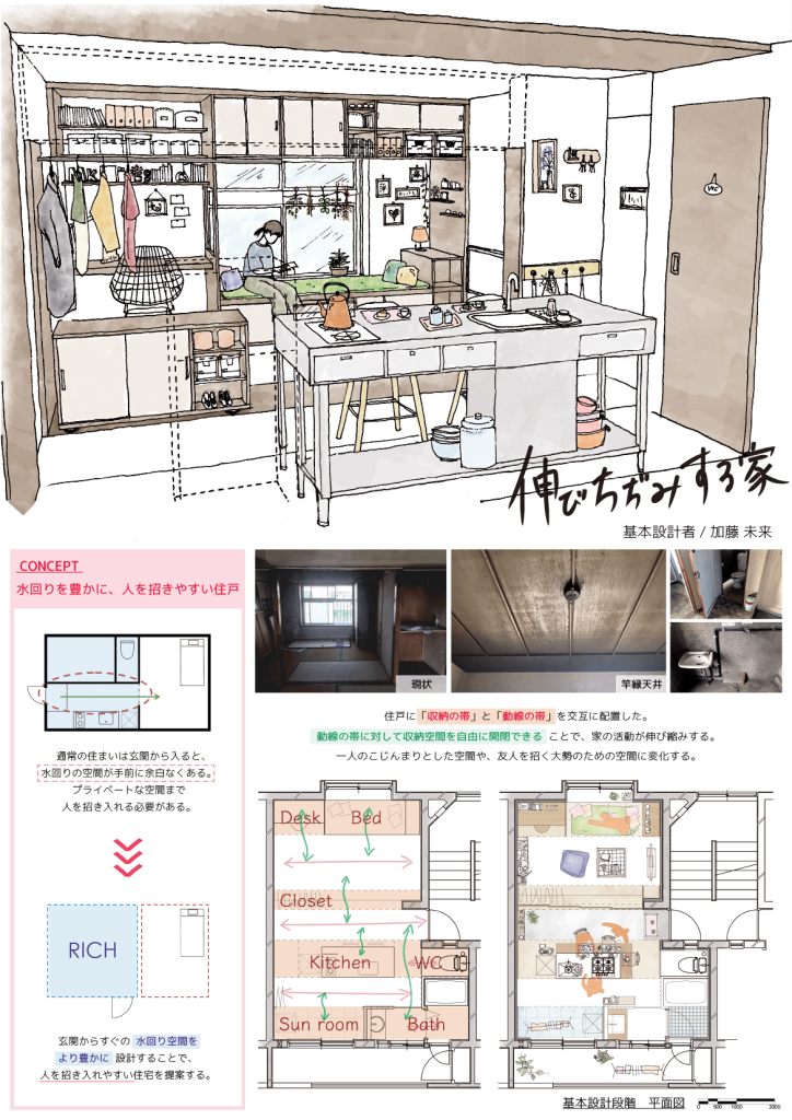 今回の受賞デザインは、2019年5月から建築学専攻の学生と東京都住宅供給公社が共同で取り組む興野町住宅の住戸リノベーションのデザインです。
